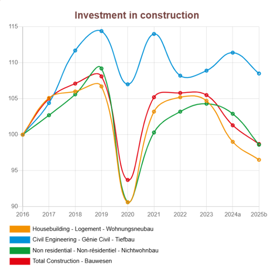 以欧盟主要的两大经济体德国、法国来看,整体建筑业依然极度低迷;德国住宅建设订单量持续下滑,土木工程订单量开始增长(2024年+3.4%):
