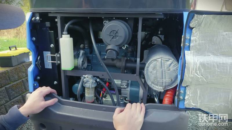 凑近查看发动机细节:这是台久保田D722 EF18,0.7升液冷三缸柴油发动机,能输出10.2千瓦(约13马力),以异常省油和高品质著称。他按照英文说明书第14项找油位 gauge,发现油尺就藏在柴油滤芯后面,油位完全正常,一切就绪。