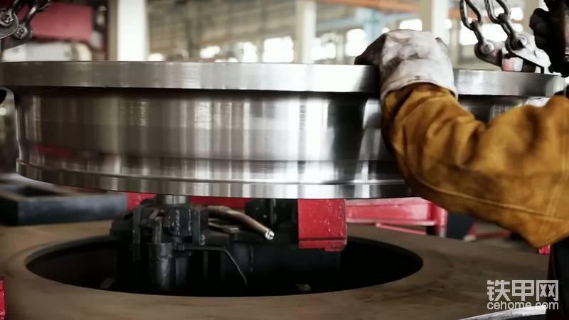 切割后的零件被运至2号厂房的焊接车间。这里采用价值4000万欧元的尖端焊接设备,32台机器人取代了24名工人,不仅焊接精度远超人工,速度也提升了一倍。挖掘机的“心脏”——回转支承(连接上部回转结构与底盘的核心部件)在此完成焊接:内部120齿的齿圈与12齿的链轮需承受4吨负荷,工人需在10分钟内完成毫米级定位,再由机器人进行满焊,确保连接终生稳固。